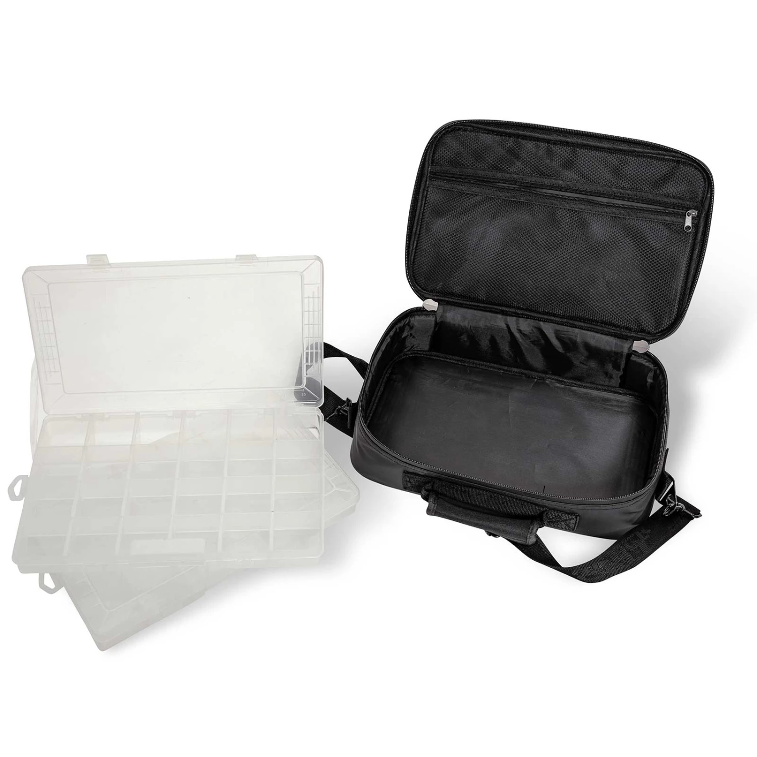 Umhängetasche für Spinn- und Aktivangler mit zwei Plastikboxen. Hier finden Blinker, Gummifische und Clonk Teaser ausreichend Platz.