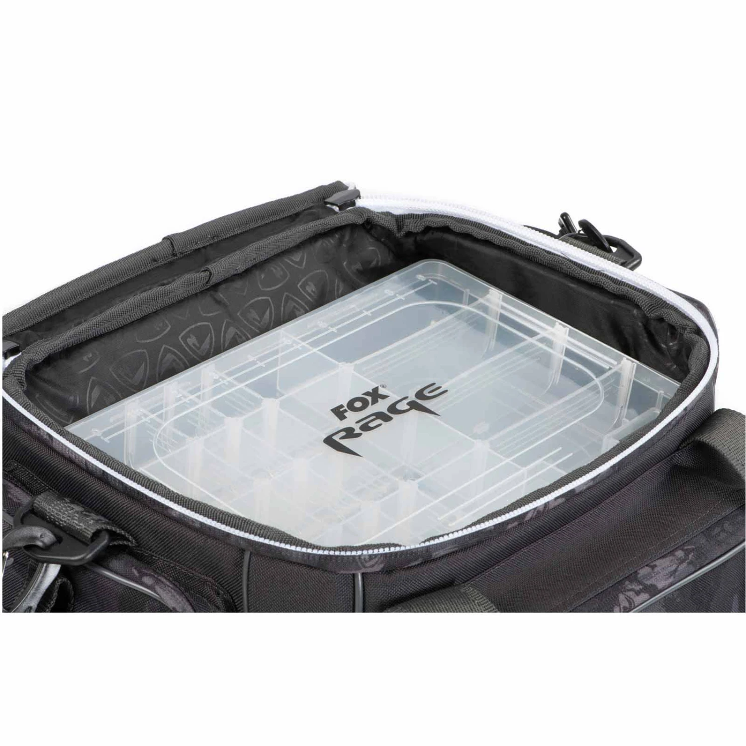 Diese clever durchdachte Fox Rage Voyager Camo Medium Carryall Angeltasche mit Boxen bietet Platz für zahlreiche Kleinteile und Angelzubehör.