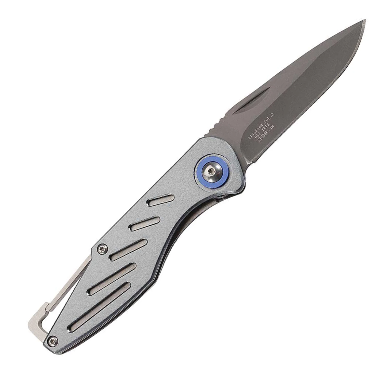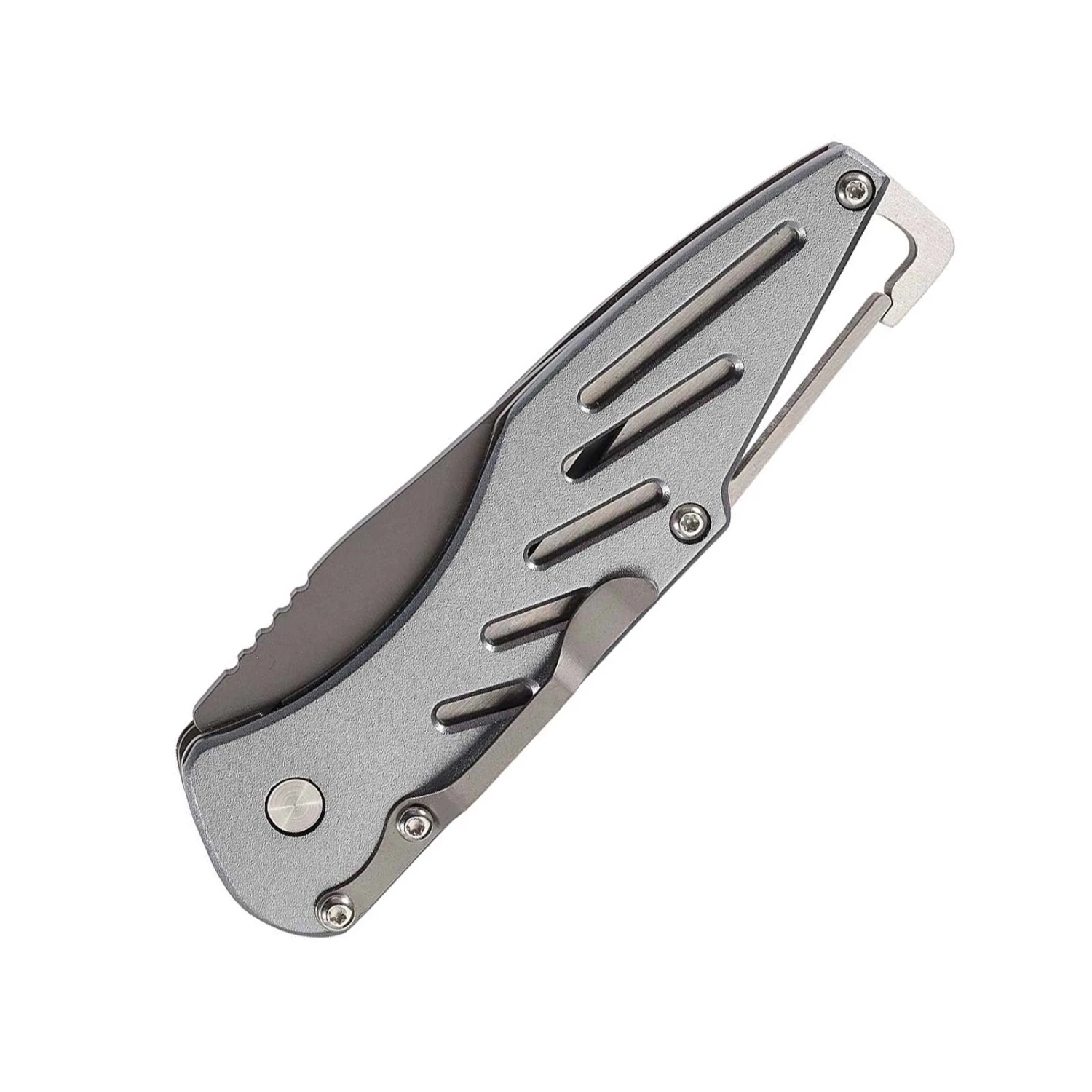Der Griff ist neben grau anodisierten Heftschalen mit einem praktischen Karabiner und einem Taschenclip versehen.