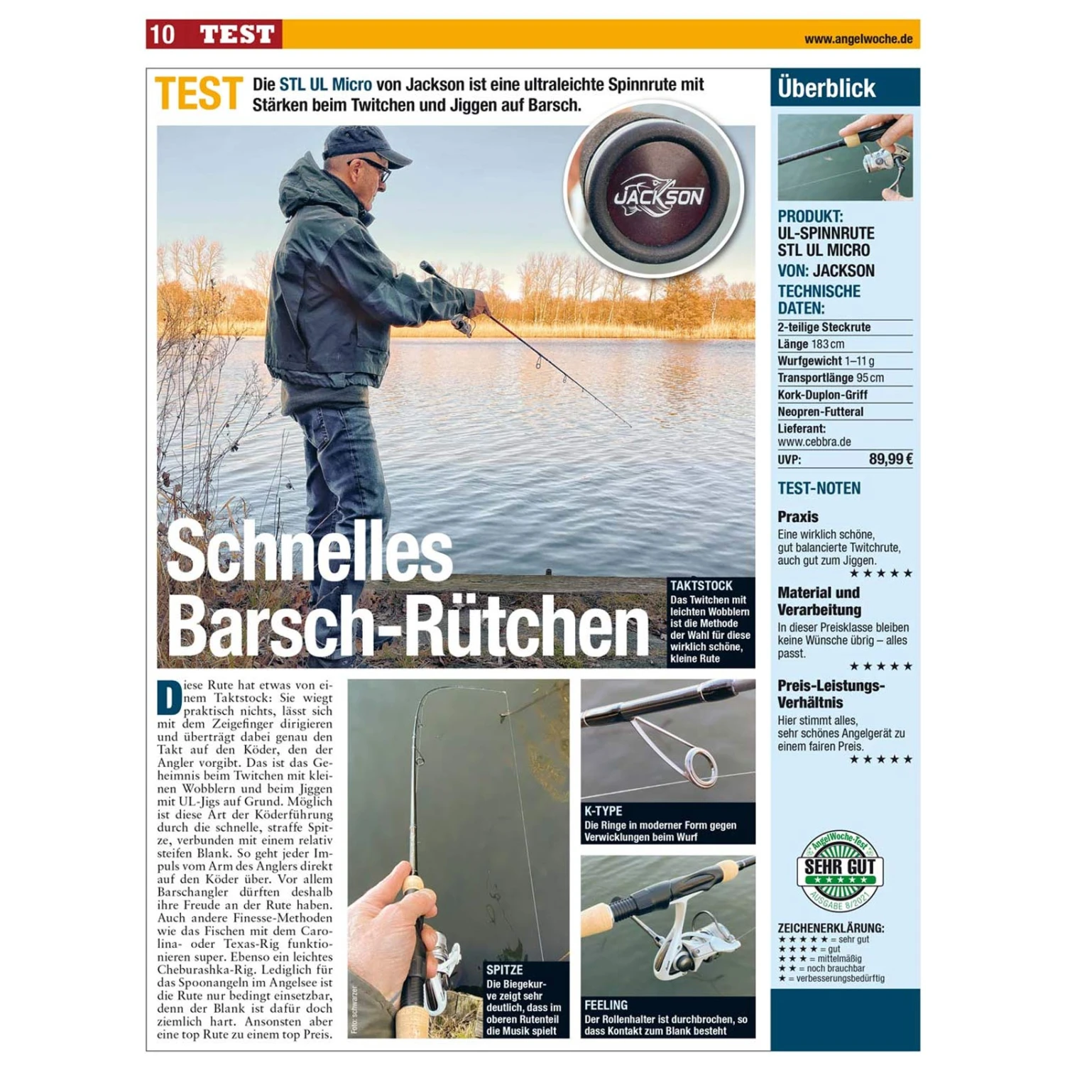 Fazit AngelWoche: Die STL UL Micro von Jackson ist eine ultraleichte Spinnrute mit Stärken beim Twitchen und Jiggen auf Barsch. In dieser Preisklasse bleiben keine Wünsche übrig – alles passt.