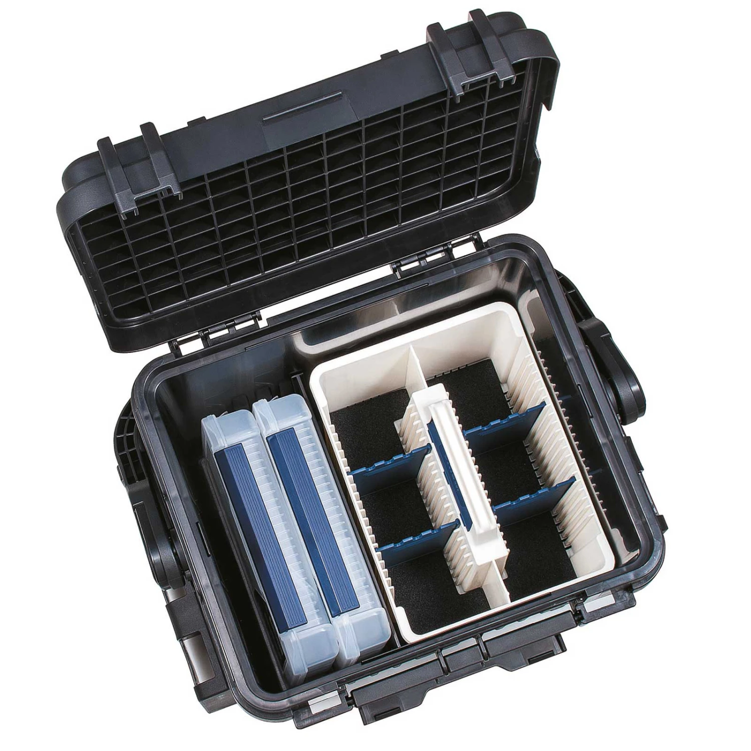 Optimal für Forellen-und Ansitzangler. In den großen, unterteilbaren Deckelfächern aller Boxen ist reichlich Platz für die übersichtliche Aufnahme von Vorfächern, Zange, Wirbeln usw.. Die Deckel haben eine Sicherung gegen ungewolltes Öffnen. Die Boxen können mit bis zu 4 Rutenhaltern, Tragegurt, Sidepocket, Side Box, Multihanger, Multiholder, Seitentabletts, frei unterteilteilbaren Einsatzboxen, Köderhaltern und Getränkehaltern