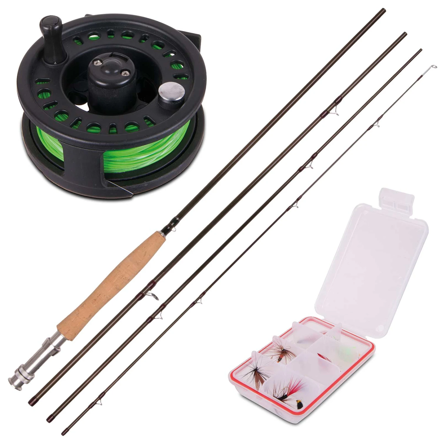 Fliegenfischerset der Klasse AFTMA 5 – 6 bestehend aus Vollkohlefaserrute mit Korkgriff und Alu-Schraubrollenhalter.