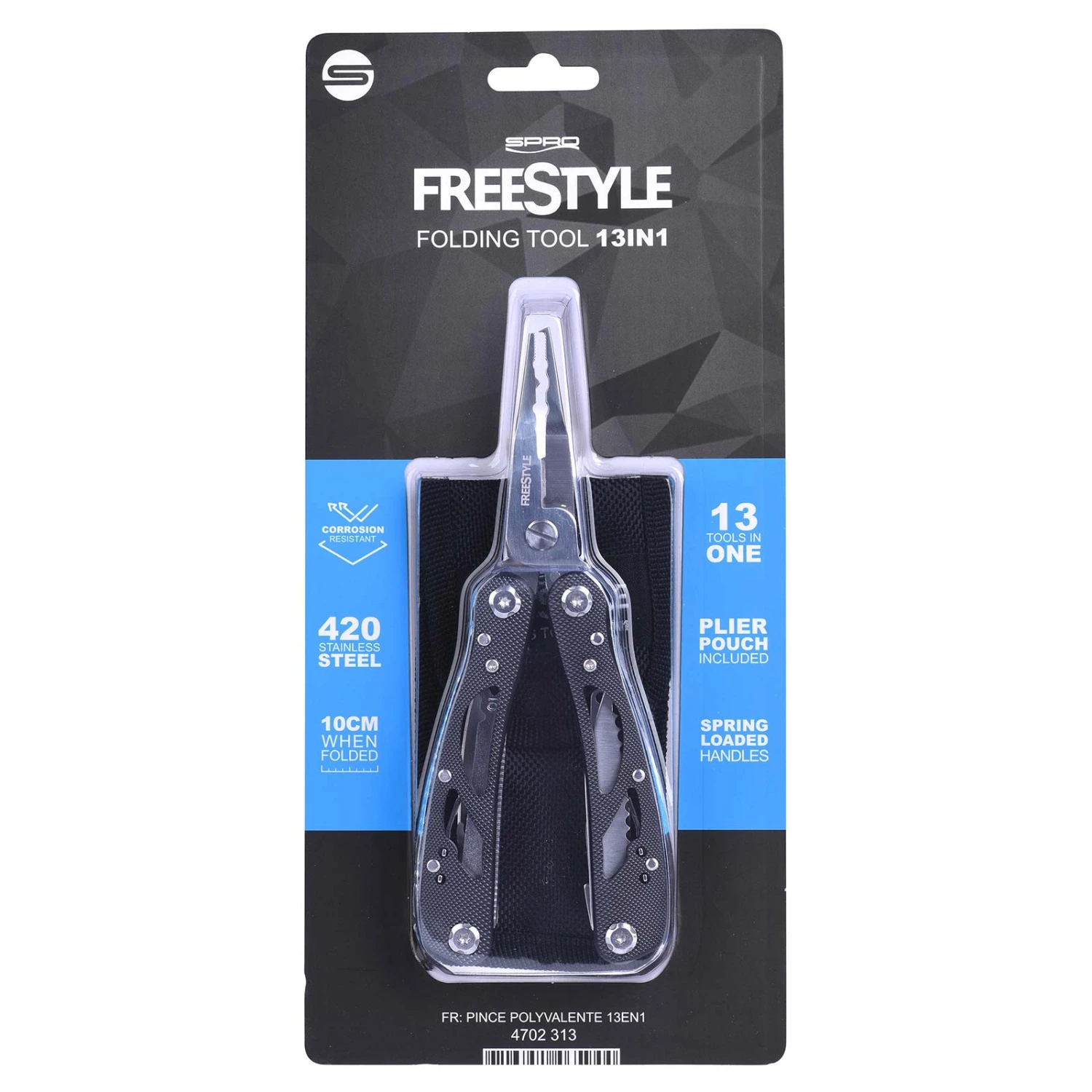 Insgesamt hat das Spro Freestyle Folding Tool nicht weniger als 13 verschiedene Werkzeuge in 1! Im Zangenmodus ist der Griff gefedert, sodass er sehr einfach und bequem zu bedienen ist.