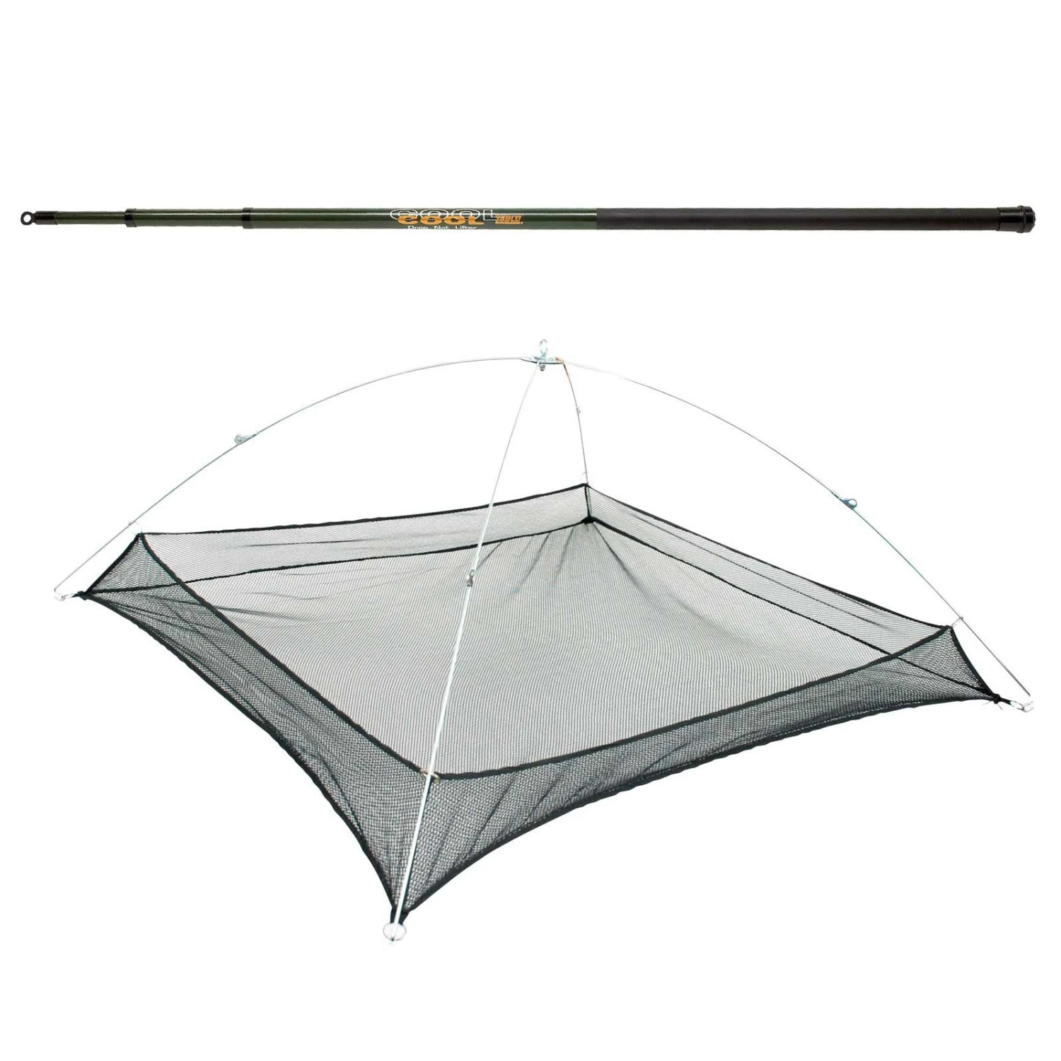 Solider Ausführung mit Klappbügel für geringes Transportmaß. Diese Köderfischsenke verfügt über einen hochgezogenen Rand, der als Fluchtschutz dient. Abmessung montiert: 100 x 100 cm Maschenweite: 6mm