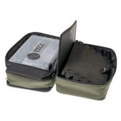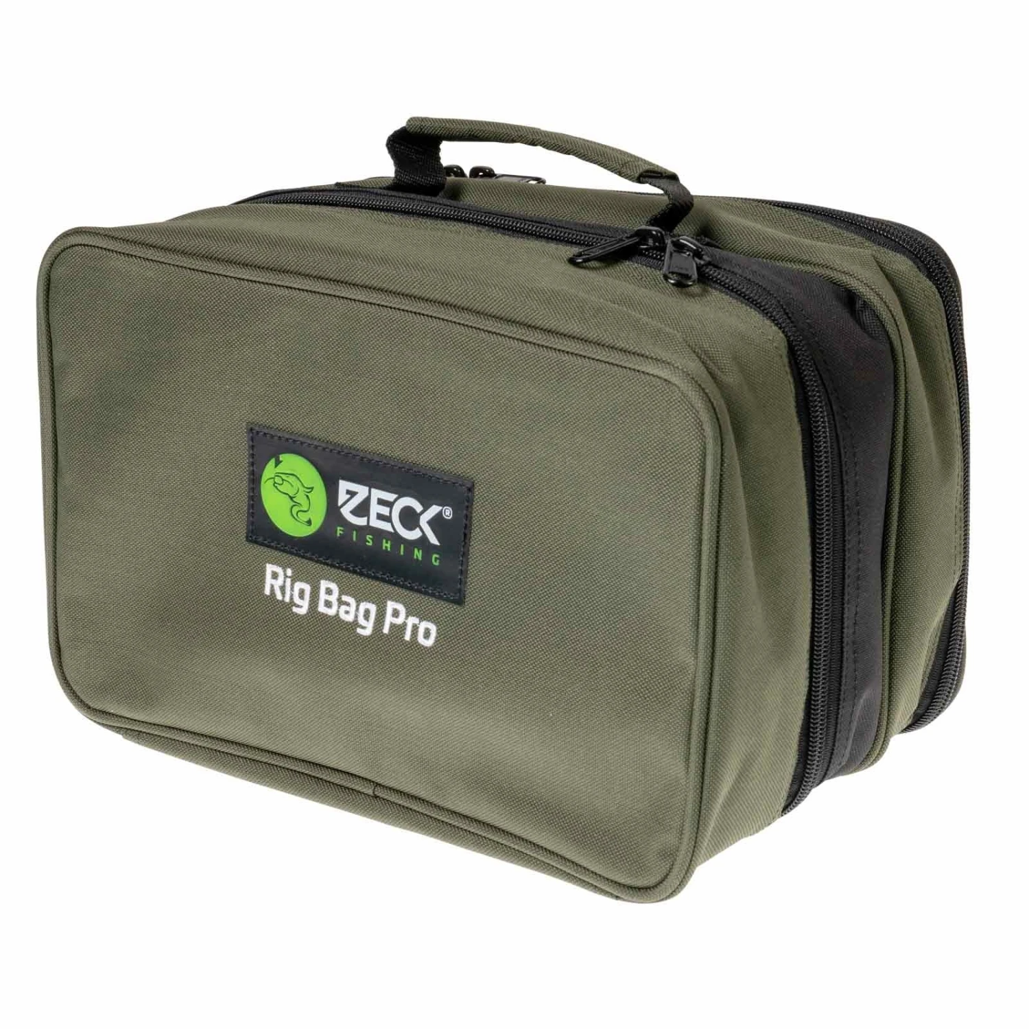 Der Zeck Rig Bag Pro ist eine Tasche zum Verstauen von Kleinteilen, Vorfachmaterial, Werkzeug und fertig gebundenen Vorfächern. Auf der einen Seite ist mittels Klettverschluss eine wasserdichte Tackle Box fixiert. Auf der gegenüberliegenden Seite befindet sich eine EVA Board mit Stiften zur Fixierung der Vorfächer. In der hinteren Tasche, die separat mit Reißverschluss abgetrennt ist, gibt es ausreichend Platz für Vorfachspulen, Quetschhülsenzange und Co.